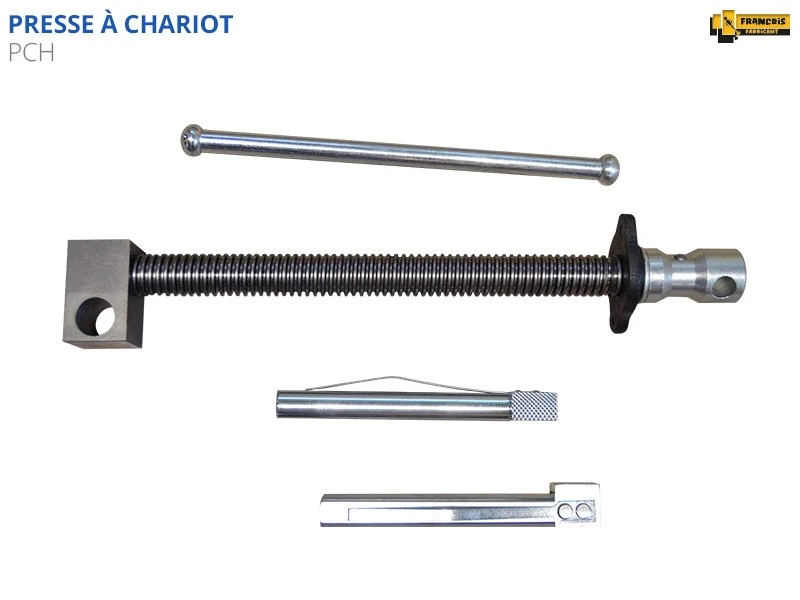 - En bout, une presse à chariot PCH, Vis filetée en acier qui permet le déplacement d’un poteau de serrage dans une saignée pratiquée sur le plateau.